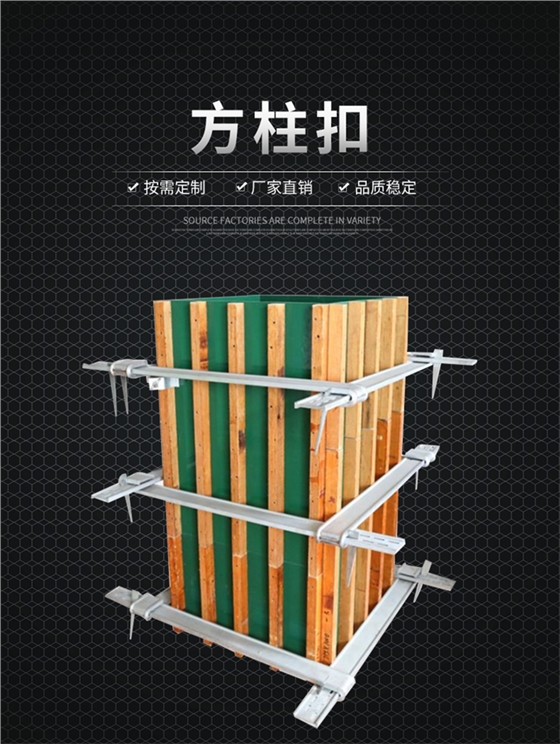 方柱扣又名方圆扣,是应用于建筑施工中打造方柱柱体的新型紧固件,其实适用于方柱柱体在定制方柱模板及普通模板(含木方)支模后的快速加固,其新颖的构造、安装与传统的架管、槽钢加固区别明显。