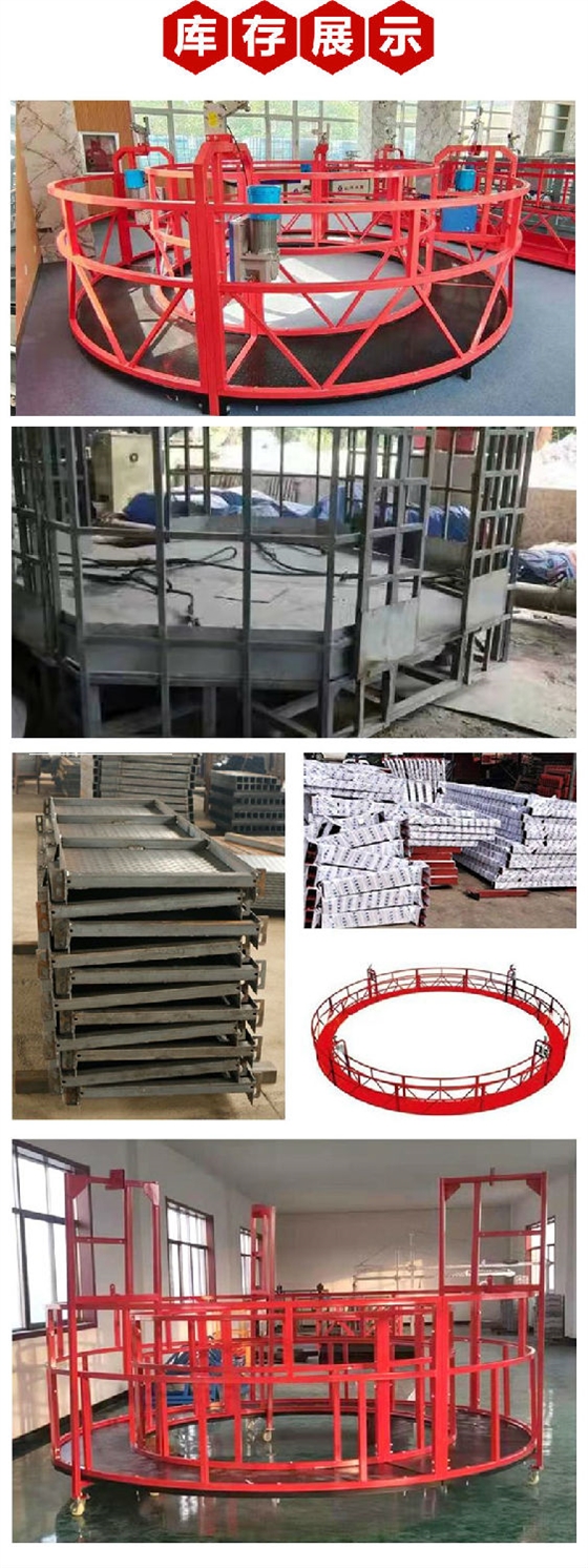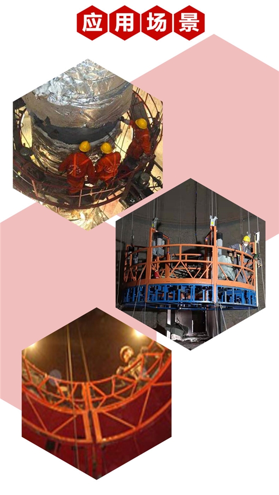 烟囱内壁吊篮由施工平台、载人吊篮、悬挂机构、钢丝绳、安全绳、提升机、安全锁、电气控制系统等组成。为了便于运输和搬运,产品全部做成可拆卸形式,达到现场并搬运进烟囱内后组装成整机。